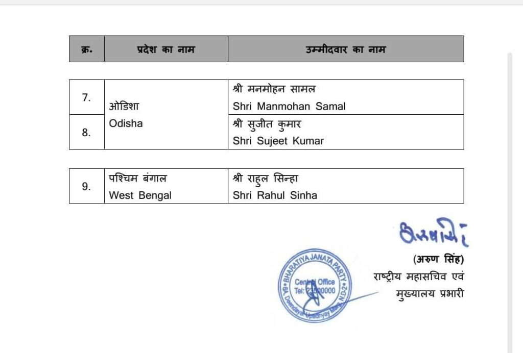 ନୂଆ ଦିଲ୍ଲୀ :- ରାଜ୍ୟସଭା ପ୍ରାର୍ଥୀ ଘୋଷଣା କଲା ବିଜେପି ।ବିଜେପି ରାଜ୍ୟ ସଭାପତି ମନମୋହନ ସାମଲ, ସୁଜିତ କୁମାରଙ୍କ ନାଁ ଘୋଷଣା । ବିଜେପି କେନ୍ଦ୍ରୀୟ କମିଟି ପକ୍ଷରୁ ଘୋଷଣା।
