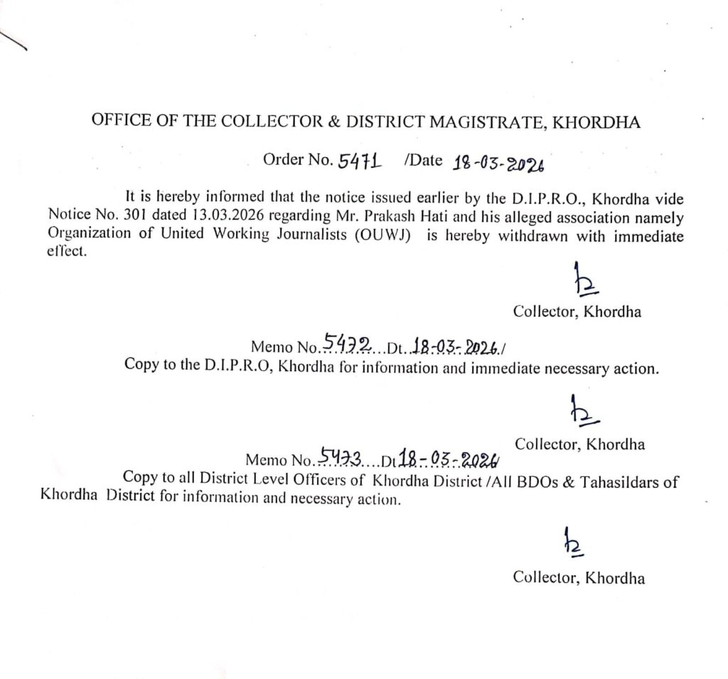 ଖୋରଧା -(୧୮/୩)’- କିଛି ଅସାମାଜିକ ତତ୍ତ୍ୱଙ୍କ ଏକ ପତ୍ର କୁ ତର୍ଜମା ନକରି ଖୋରଧା ଜିଲ୍ଲା ପ୍ରଶାସନ ଏବଂ ଜିଲ୍ଲା ସୁଚନା ଓ ଲୋକସମ୍ପର୍କ ଅଧିକାରୀ ସମ୍ମିଳିତ କର୍ମଜୀବୀ ସାମ୍ବାଦିକ ସଙ୍ଘ (ଓ.ୟୁ.ଡବ୍ଲୁ.ଜେ) ଖୋରଧା ଜିଲ୍ଲା ଶାଖା ସଭାପତି ପ୍ରକାଶ କୁମାର ହାତୀ ଙ୍କ କାର୍ଯ୍ୟଶୈଳୀ ଓ ସ୍ୱଚ୍ଛତା ଉପରେ ଉଠାଇଥିବା ପ୍ରଶ୍ନ କୁ ସଂଘ ତରଫରୁ ତୀବ୍ର ବିରୋଧ କରଯାଇଥିଲା।