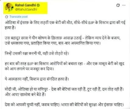 ସେ କରିଥିବା ଏକ୍ସ ପୋଷ୍ଟରେ ଲେଖାଯାଇଛି ଯେ, “ଓଡ଼ିଶାରେ ନ୍ୟାୟ ପାଇଁ ଲଢ଼ୁଥିବା ଝିଅର ମୃତ୍ୟୁ ହୋଇଛି। ଏହା ବିଜେପି ବ୍ୟବସ୍ଥା ଦ୍ୱାରା କରାଯାଇଥିବା ସିଧାସଳଖ ହତ୍ୟା ବୋଲି କୁହାଯାଇପାରିବ। ସେହି ସାହସୀ ଛାତ୍ରୀ ଯୌନ ଶୋଷଣ ବିରୋଧରେ ସ୍ୱର ଉଠାଇଥିଲେ। କିନ୍ତୁ ନ୍ୟାୟ ବଦଳରେ ତାଙ୍କୁ ବାରମ୍ବାର ଧମକ, ହଇରାଣ, ଅପମାନିତ କରାଯାଇଥିଲା।ଯେଉଁମାନେ ତାଙ୍କୁ ସୁରକ୍ଷା ଦେବା କଥା, ସେମାନେ ତାଙ୍କୁ ଭାଙ୍ଗିଦେଲେ। ପ୍ରତ୍ୟେକ ଥର ପରି, ବିଜେପି ବ୍ୟବସ୍ଥା ଅଭିଯୁକ୍ତଙ୍କୁ ସୁରକ୍ଷା ଦେଇ ଏକ ନିର୍ଦ୍ଦୋଷ ଝିଅକୁ ନିଜକୁ ଜାଳି ଦେବା ପାଇଁ ବାଧ୍ୟ କରିଦେଲା। ଏହା ଆତ୍ମହତ୍ୟା ନୁହେଁ, ଏହା ବ୍ୟବସ୍ଥା ଦ୍ୱାରା ସଂଗଠିତ ହତ୍ୟା। ମୋଦି ଜୀ, ଓଡ଼ିଶା ହେଉ କି ମଣିପୁର, ଦେଶର ଝିଅମାନେ ଜଳୁଛନ୍ତି, ଭାଙ୍ଗି ପଡୁଛନ୍ତି, ମରୁଛନ୍ତି। ଆଉ ଆପଣ? ଆପଣ ଚୁପ୍ ବସିଛନ୍ତି। ଦେଶ ଆପଣଙ୍କ ନୀରବତା ଚାହେଁ ନାହିଁ, ଉତ୍ତର ଚାହେଁ। ଭାରତର ଝିଅମାନେ ସୁରକ୍ଷା ଏବଂ ନ୍ୟାୟ ଚାହାଁନ୍ତି।”