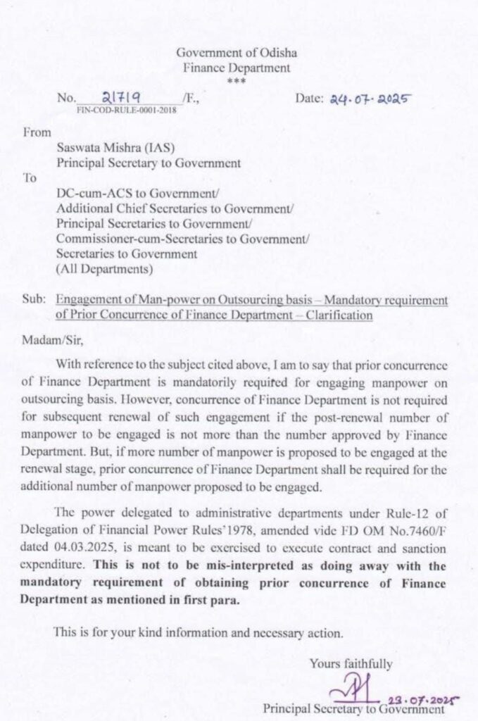 ଭୁବନେଶ୍ୱର :- ସରକାରଙ୍କ ଅର୍ଥ ବିଭାଗ ଦ୍ଵାରା ଏକ ବିଜ୍ଞପ୍ତି ପ୍ରକାଶ ପାଇଛି ।ବିଭାଗ ର ପତ୍ର ସଂଖ୍ୟା 21719/F. ତାରିଖ ୨୪.୦୭.୨୫ ଅନୁଯାୟୀ ଅର୍ଥ ବିଭାଗ ର ବିନା ଅନୁମତିରେ ଠିକା ସଂସ୍ଥା ଙ୍କୁ ନିଯୁକ୍ତି ଦେଇପାରିବେ ନାହିଁ ବୋଲି ଏହି ନିର୍ଦ୍ଦେଶନାମା କୁ ସମସ୍ତ ବିଭାଗ କୁ ପ୍ରେରଣ କରାଯାଇଛି।