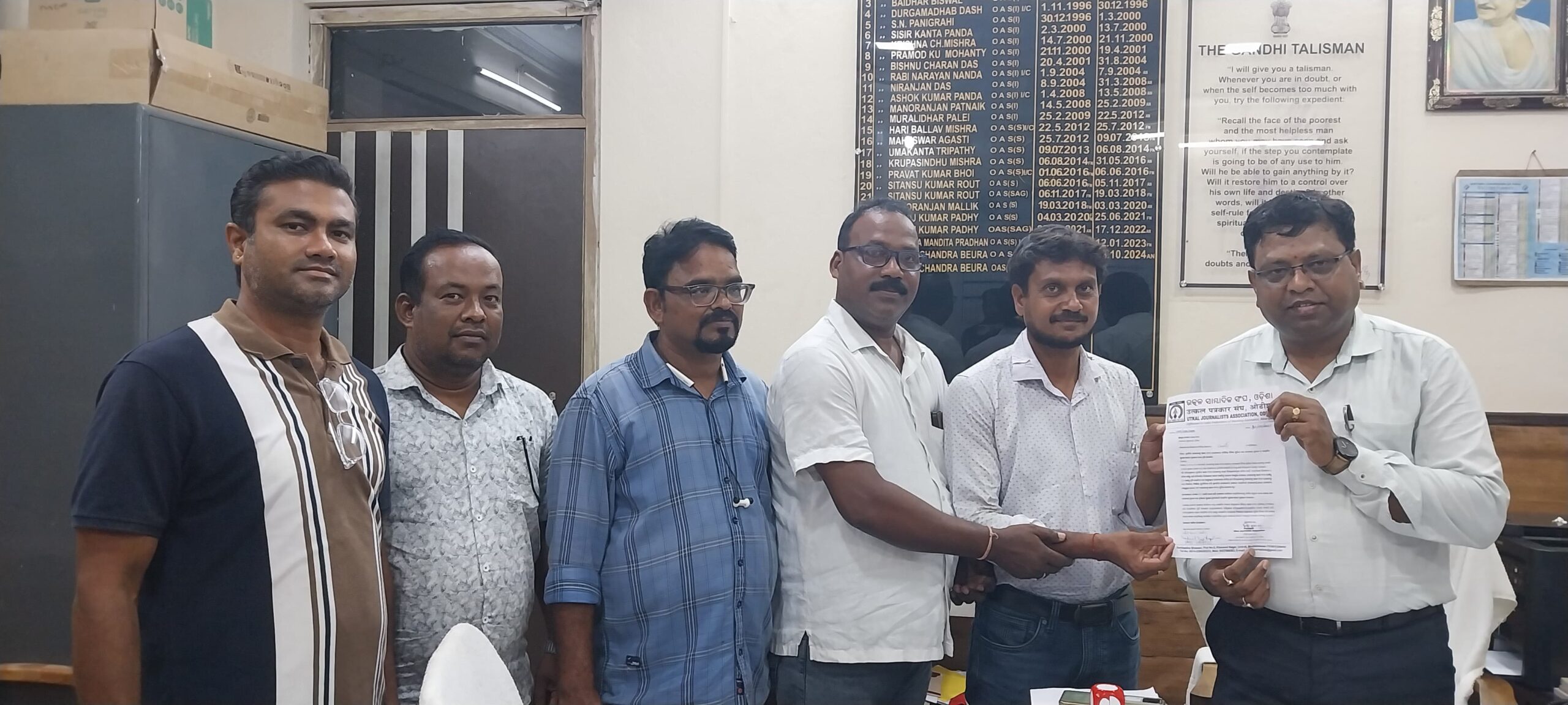 ଖୋରଧା ;- ଉତ୍କଳ ସାମ୍ବାଦିକ ସଂଘ ସହବନ୍ଧିତ ଖୋର୍ଦ୍ଧା ଜିଲ୍ଲା ସାମ୍ବାଦିକ ସଂଘ ପକ୍ଷରୁ ଏକ ପ୍ରତିନିଧି ମଣ୍ଡଳୀ ଵିଭିନ୍ନ ଦାବି ନେଇ ମୁଖ୍ୟମନ୍ତ୍ରୀଙ୍କ ଉଦ୍ଦେଶ୍ୟରେ ଅତିରିକ୍ତ ଜିଲ୍ଲାପାଳ ଶ୍ରୀ ପ୍ରତାପ ଚନ୍ଦ୍ର ବେଉରାଙ୍କୁ ଆଜି ଦାବିପତ୍ର ପ୍ରଦାନ କରିଛନ୍ତୁ ।