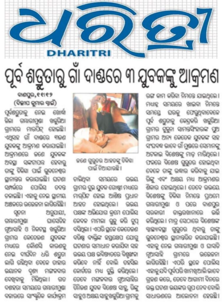 ଖୋର୍ଦ୍ଧା : ଖବର ପ୍ରସାରଣ ଙ୍କୁ ନେଇ ବାଣପୁର ବ୍ଲକ ଧରିତ୍ରୀ ପ୍ରତିନିଧି ଦିଲୀପ କୁମାର ସ୍ୱାଇଁ ଙ୍କୁ ଗମ୍ଭାରୀମୁଣ୍ଡା ଠାରେ ସଂଘବଧ ଭାବେ ମରଣାନ୍ତକ ଆକ୍ରମଣ କରାଯାଇଛି ତାଙ୍କୁ ବାଣପୁର ମେଡିକାଲ ରୁ ଅଧିକ ଚିକିଚ୍ଛା ପାଇଁ ଭୁବନେଶ୍ୱର କ୍ୟାପିଟାଲ ହସ୍ପିଟାଲ କୁ ସ୍ଥାନାନ୍ତର କରାଗଲା ।