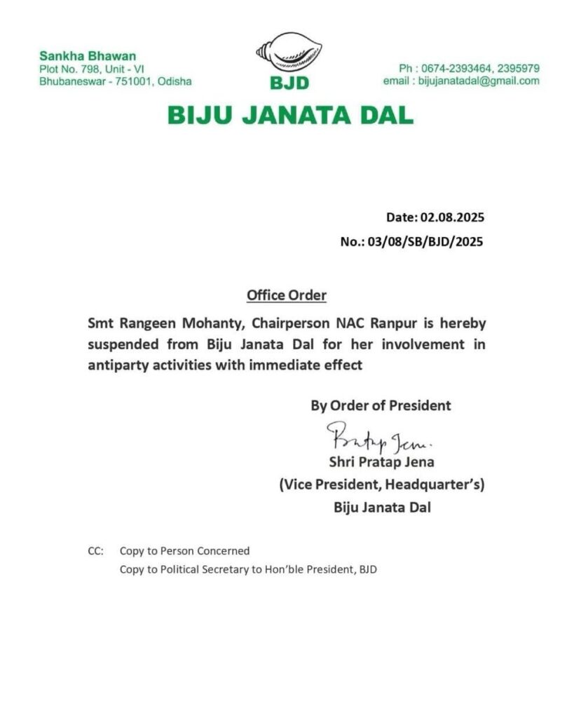 ରାଜ୍ୟ ବିଜେଡି ରୁ ନିଲମ୍ବିତ ହେଲେ ରଣପୁର ପୌର ପରିଷଦ ଅଧ୍ୟକ୍ଷା Subha KhabarAugust 2, 2025 ଭୁବନେଶ୍ୱର :- ଦଳ ବିରୋଧୀ କାର୍ଯ୍ୟ ପାଇଁ ବିଜେଡି ଦଳରୁ ନିଲମ୍ବିତ ହେଲେ ରଣପୁର ପୌର ପରିଷଦ ଅଧ୍ୟକ୍ଷା ରଙ୍ଗୀନ ମହାନ୍ତି । Advertisement Subha Khabar is now on Whatsapp Join and get latest news update delivered to you via whatsapp Join Now