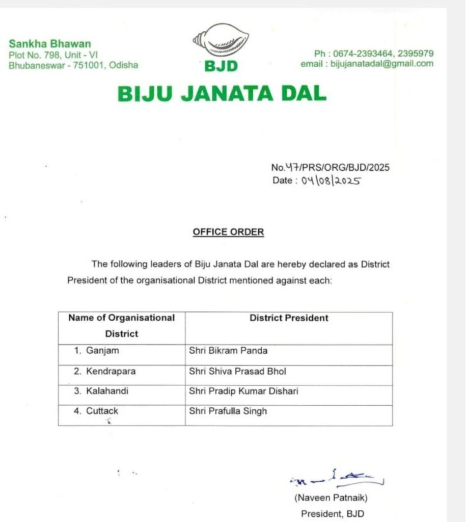 ଭୁବନେଶ୍ୱର: ୪ ଜିଲ୍ଲା ସଭାପତିଙ୍କ ନାଁ ଘୋଷଣା କରିଛନ୍ତି ବିଜେଡି ସୁପ୍ରିମୋ ନବୀନ ପଟ୍ଟନାୟକ। ଗଞ୍ଜାମ, କେନ୍ଦ୍ରାପଡା, କଳାହାଣ୍ଡି ଓ କଟକ ଜିଲ୍ଲାର ବିଜେଡି ସଭାପତିଙ୍କ ନାଁ ଘୋଷଣା ହୋଇଛି। ଗଞ୍ଜାମ ଜିଲ୍ଲା ସଭାପତି ଭାବେ ବିକ୍ରମ ପଣ୍ଡା, କେନ୍ଦ୍ରାପଡା ଜିଲ୍ଲା ସଭାପତି ଶିବ ପ୍ରସାଦ ଭୋଳ, କଳାହାଣ୍ଡି ଜିଲ୍ଲା ସଭାପତି ପ୍ରଦୀପ ଦିଶାରୀ ଓ କଟକ ଜିଲ୍ଲା ସଭାପତି ହୋଇଛନ୍ତି ପ୍ରଫୁଲ୍ଲ ସିଂହ । ପୂର୍ବରୁ ବିଜେଡି ସୁପ୍ରିମୋ ୨୪ଟି ଜିଲ୍ଲାର ସଭାପତିଙ୍କ ନାଁ ଘୋଷଣା କରିଥିଲା।