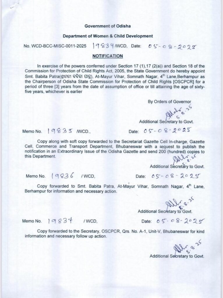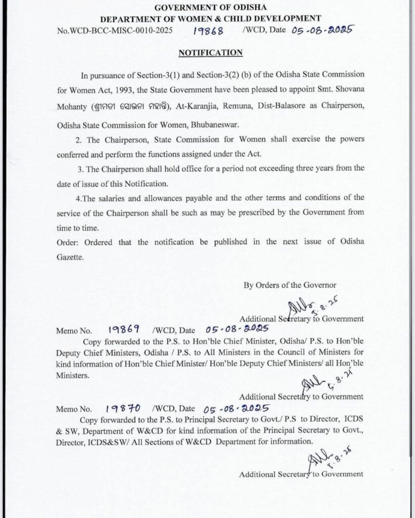 ଭୁବନେଶ୍ୱର, ୫/୮: ସୋଭନା ମହାନ୍ତି ହେଲେ ମହିଳା କମିଶନ ଅଧ୍ୟକ୍ଷା ଓ ବବିତା ପାତ୍ର ହେଲେ ଶିଶୁ ସୁରକ୍ଷା ଆୟୋଗ ଅଧ୍ୟକ୍ଷା ଏ ନେଇ ସରକାରଙ୍କ ପକ୍ଷରୁ ବିଜ୍ଞପ୍ତି ଜାରି କରାଯାଇଛି।