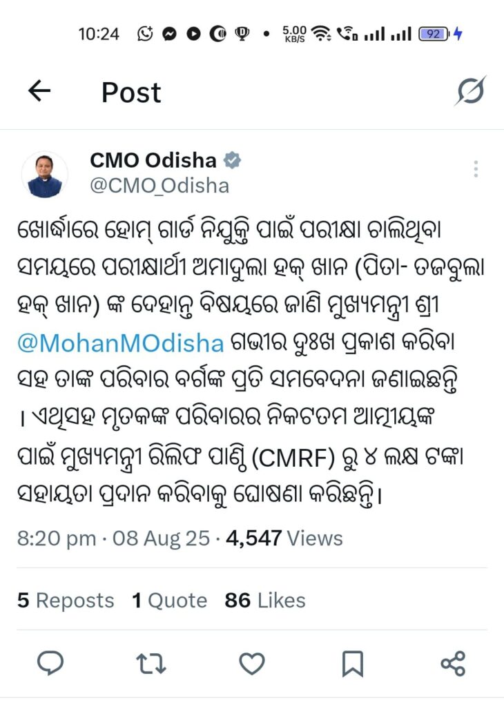 ଖୋର୍ଦ୍ଧା :- ଖୋର୍ଦ୍ଧାରେ ହୋମ୍ ଗାର୍ଡ ନିଯୁକ୍ତି ପାଇଁ ପରୀକ୍ଷା ଚାଲିଥିବା ସମୟରେ ପରୀକ୍ଷାର୍ଥୀ ଅମାଦୁଲା ହକ୍ ଖାନ ,ପିତା- ତଜବୁଲା ହକ୍ ଖାନ ସା /ପୋ କେରଙ୍ଗ ଙ୍କ ଦେହାନ୍ତ ବିଷୟରେ ଜାଣି ମୁଖ୍ୟମନ୍ତ୍ରୀ ମୋହନ ଚରଣ ମାଝୀ ଗଭୀର ଦୁଃଖ ପ୍ରକାଶ କରିବା ସହ ତାଙ୍କ ପରିବାର ବର୍ଗଙ୍କ ପ୍ରତି ସମବେଦନା ଜଣାଇଛନ୍ତି । ଏଥିସହ ମୃତକଙ୍କ ପରିବାରର ନିକଟତମ ଆତ୍ମୀୟଙ୍କ ପାଇଁ ମୁଖ୍ୟମନ୍ତ୍ରୀ ରିଲିଫ ପାଣ୍ଠି ରୁ ୪ ଲକ୍ଷ ଟଙ୍କା ସହାୟତା ପ୍ରଦାନ କରିବାକୁ ଘୋଷଣା କରିଛନ୍ତି।