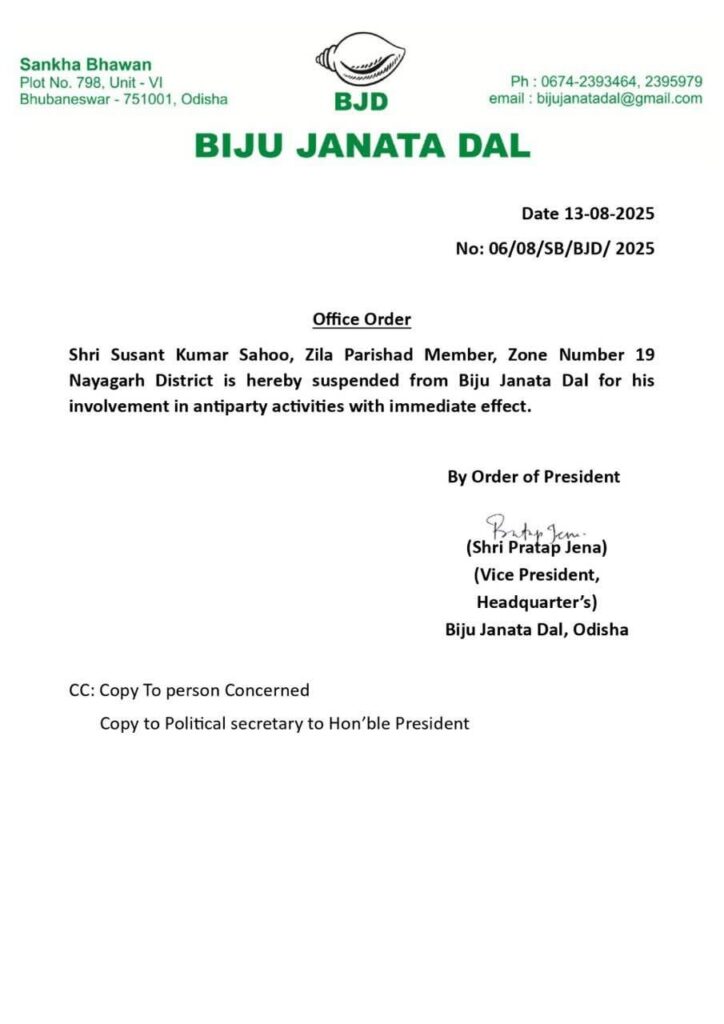ଭୁବନେଶ୍ୱର :- ଦଳ ବିରୋଧୀ କାର୍ଯ୍ୟ ପାଇଁ ସଭାପତି ଶ୍ରୀ ନବୀନ ପଟ୍ଟନାୟକ ଙ୍କ ନିର୍ଦ୍ଦେଶକ୍ରମେ ନୟାଗଡ଼ ଜିଲ୍ଲାର ୧୯ ନମ୍ବର ଜୋନର ଜିଲ୍ଲା ପରିଷଦ ସଦସ୍ୟ ଶ୍ରୀ ସୁଶାନ୍ତ କୁମାର ସାହୁଙ୍କୁ ବିଜେଡିରୁ ନିଲମ୍ବନ କରାଯାଇଛି।