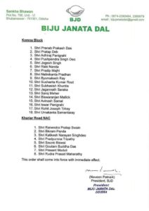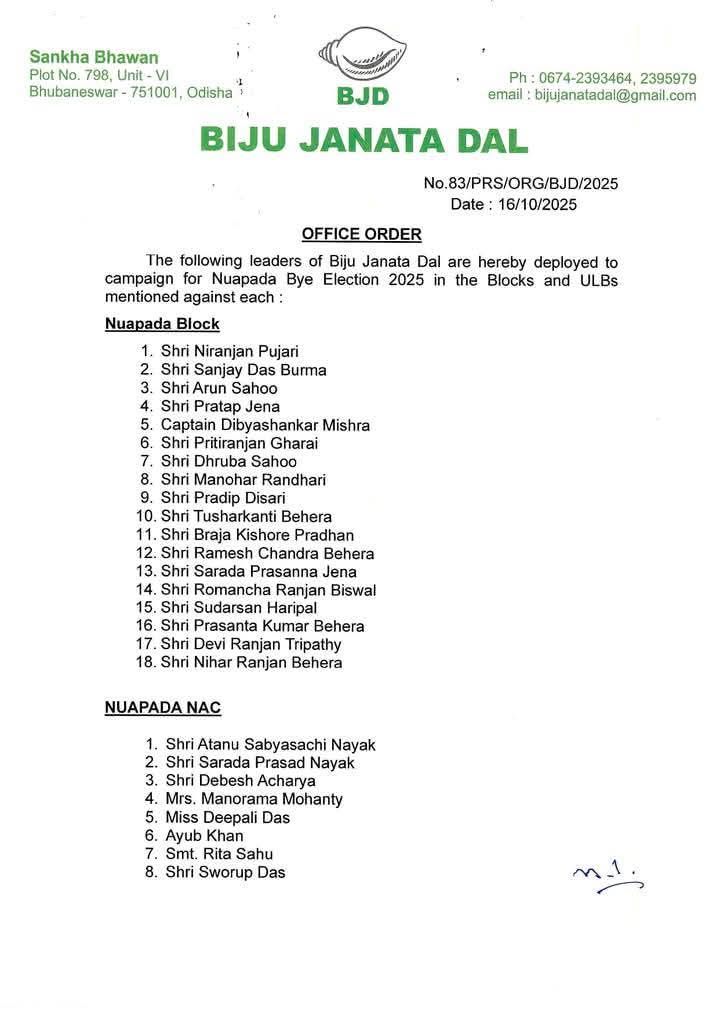 ଭୁବନେଶ୍ବର,(୧୬/୧୦):- ନୂଆପଡ଼ା ବିଧାନ ସଭା ଉପ ନିର୍ବାଚନ ପାଇଁ ବିଜେଡି ରାଜ୍ୟ ସଭାପତି ନବୀନ ପଟ୍ଟନାୟକ ଘୋଷଣା କରିଛନ୍ତି ନୂଆ ଟିମ୍ ।ନୂଆପଡ଼ା ବିଧାନସଭା ନିର୍ବାଚନ ମଣ୍ଡଳୀ ନୂଆପଡା ବ୍ଲକ୍,  ନୂଆପଡ଼ା ଏନ୍ ଏ ସି, କୋମନା ବ୍ଲକ ଓ ଖରୀଆର ରୋଡ ଏନ୍ ଏ ସି କୁ ନେଇ ଗଠିତ ହୋଇଥିବା ବେଳେ ଦଳ ରାଜ୍ୟସଭାପତି ନୂଆପଡ଼ା ବ୍ଲକ୍ ପାଇଁ ୧୮ ଜଣ,ନୂଆପଡ଼ା ଏନ୍ ଏ ସି ପାଇଁ ୮ ଜଣ,କୋମନା ବ୍ଲକପାଇଁ ୧୮ ଓ  ଖରୀଆର ରୋଡ ଏନ୍ ଏ ସି ପାଇଁ ୬ ଜଣ ନେତା ଙ୍କୁ ଦାୟିତ୍ବ ଦେଇଛନ୍ତି । ଏହି ନେତା ମାନେ ନୂଆ ପଡ଼ା ରେ ପହଁଚି ଦଳୀୟ ପ୍ରାର୍ଥୀନୀ ସ୍ନେହାଙ୍ଗିନୀ ଛୁରିଆ ପାଇଁ ପ୍ରଚାର ମଇଦାନ କୁ ଓହ୍ଲାଇବା ପାଇଁ ନିର୍ଦ୍ଦେଶ ଦେଇଛନ୍ତି ।