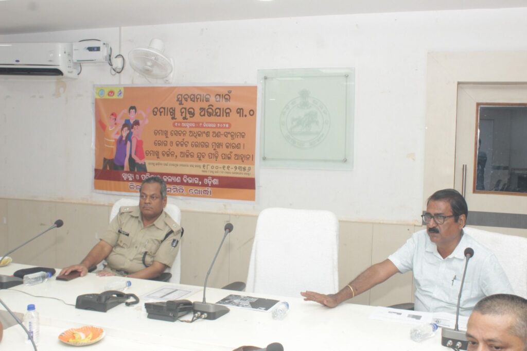ଖୋର୍ଦ୍ଧା,(୨୨/୧୦):- ଯୁବ ସମାଜ ପାଇଁ ତମାଖୁ ମୁକ୍ତ ଅଭିଯାନ ୩.୦ ଅକ୍ଟୋବର ୧୦ ତାରିଖରୁ ଡିସେମ୍ବର ୯ ତାରିଖ ପର୍ଯ୍ୟନ୍ତ ୬୦ ଦିବସ ବ୍ୟାପୀ ଜିଲ୍ଲାରେ ସଚେତନତା ଅଭିଯାନର ବିଭିନ୍ନ କାର୍ଯ୍ୟକ୍ରମ ନିମନ୍ତେ ଆଜି ଜିଲ୍ଲାପାଳଙ୍କ କାର୍ଯ୍ୟାଳୟ ସମ୍ମିଳନୀ କକ୍ଷରେ ଜିଲ୍ଲା ଜନ ସ୍ୱାସ୍ଥ୍ୟ ଅଧିକାରୀ ଡାକ୍ତର ରଞ୍ଜନ ମିତ୍ରଙ୍କ ଅଧ୍ୟକ୍ଷତାରେ ଅନୁଷ୍ଠିତ ହୋଯାଇଅଛି l