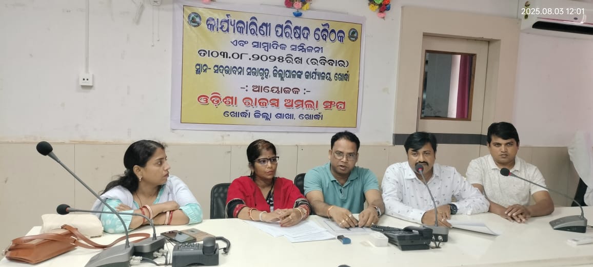 Odisha Revenue and Disaster Management Minister, Suresh Pujari, after discussing with the association, promised to resolve the issue soon and the Additional Chief Secretary of the Revenue Department, who was present there, promised to carry out the cadre reorganization within fifteen days. But even after more than a month, the cadre reorganization of the district-level revenue clerks has not been done yet. In this, the notification issued by the state government regarding ORS has made the revenue clerks deprived of promotion to the post.Therefore, Khordha District Amala Sangha announced today the mass cease work agitation on-11.08.2025 for indefinite period and they also said that the state government will be responsible for the problems that the common people will face.In this press meet Khordha District Amala Sangha President Mrutyunjaya Senapati,Working President, Manoranjan Mohapatra,Vice-President Anupama Patra, Chief Advisor Braja Kishore Mohapatra, Advisor Santosh Kumar Nishank, Secretary Arun Kumar Muduli, Organization Secretary Rashmi Ranjan Rautray and others were present.