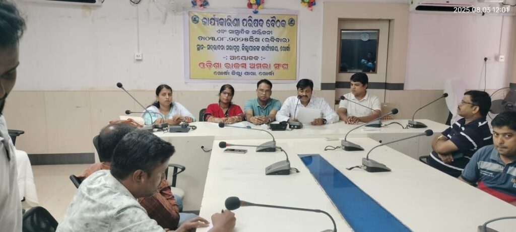 Khordha– 3/7- The executive body meeting of the Khordha District Rajaswa Amala Sangha was held at the conference hall of collectorate, khordha.In this meeting, the ten-point demands of the revenue clerks working at the district level were discussed. Out of which, the basic salary of the revenue clerks working at the district level should be increased to Level-9 as per the ORSP rules, cadre reorganization and with proper promotion of district level revenue clerks in ORS post the revenue clerks protested by wearing black bodage from 7.7.2025 onwards with a ten-point demands. As a result,